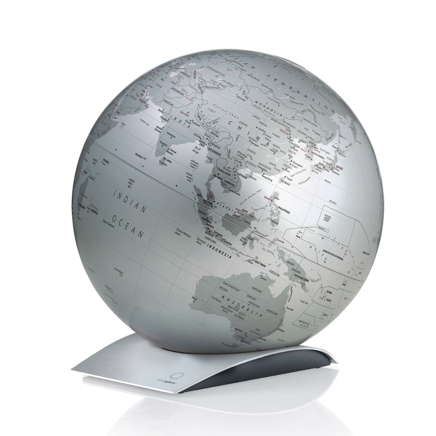 Dieser Tischglobus von Atmosphere zeichnet sich durch Stil und einzigartiges Design aus. Die Weltkugel sitzt auf einer Auflage aus Aluminium und Gummi. Da diese mit einem Kugellager ausgestattet ist lässt sich die Kugel problemlos um 360° und in alle Richtungen drehen. Zusätzlich kann die Kugel auch abgenommen werden und so überall genau betrachtet werden.