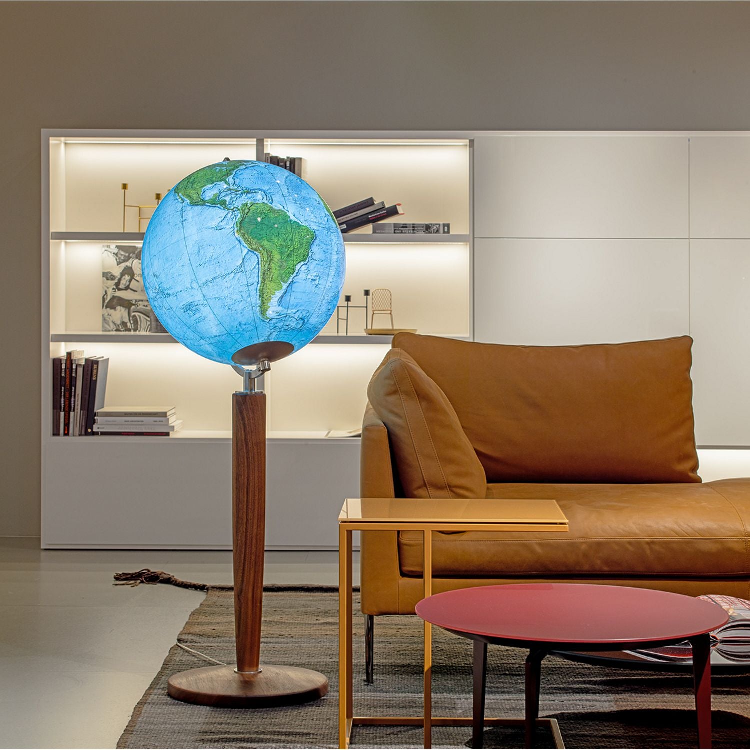 Columbus DUO ALBA Standglobus "Khan" mit 51 cm Durchmesser und Beleuchtung, Kristallglas und Edelholz-SäulenfußDie Herstellung mundgeblasener Kristallglaskugeln ist Handarbeit, die höchste Präzision erfordert und durch innovative Technik geprägt ist. Dieses Modell ist ein Meisterwerk traditioneller Globenherstellung, das mit ausgesuchten Materialien, Erfahrung, Können und Leidenschaft entsteht.Die stattliche Größe und die schlichte Eleganz machen diesen Globus zu etwas ganz Besonderem. Der Edelholz-Säulenfuß ist aus massiv, amerikanischen Nussbaum. Dank des aufwendig gestalteten Kartenbilds und den 51 cm Durchmesser, lässt der große Standglobus auch noch die Entdeckung der kleinsten Details unseres blauen Planeten zu. Mit über eineinhalb Metern Kugelumfang zeigt dieser COLUMBUS Globus unbeleuchtet das aktuelle politische Kartenbild unserer Erde und wird durch die detaillierte Darstellung der Meeresstruktur ergänzt. Beleuchten Sie den Globus, wechselt er zum physischen Kartenbild und entfaltet einen neuen Charakter. Das Meer erstrahlt in einem klaren Eisblau und die zurückhaltenden Farben der Länder treten stärker in den Vordergrund.