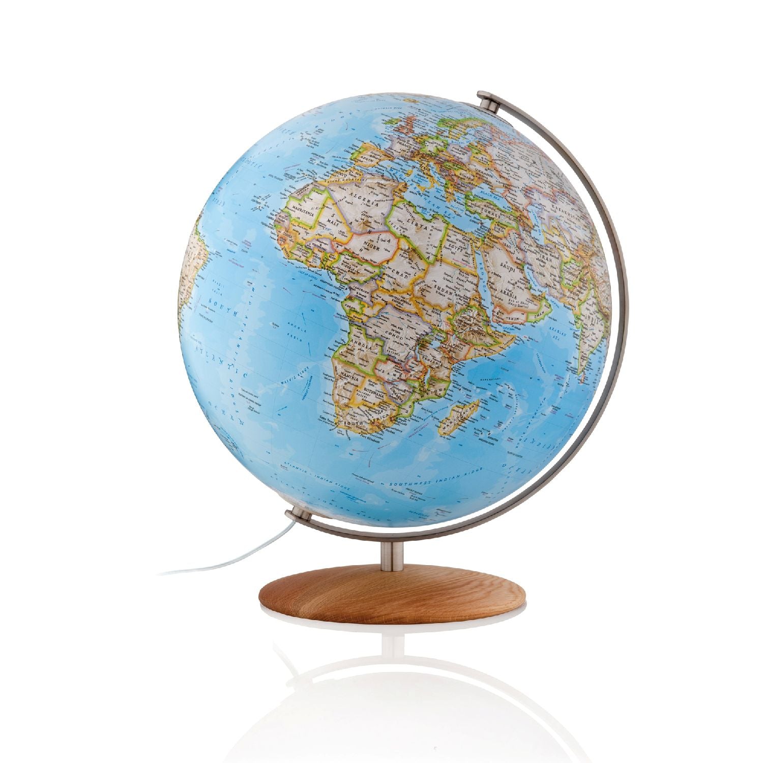 Dieser beleuchtete Tischglobus von National Geographic verbindet auf gekonnte Art und Weise Tradition und Moderne. Die Kugel hat einem Durchmesser von 37 cm und ist tradtionell handkaschiert mit der durch die National Geographic Maps Division erstellten Kartographie "Classic" oder "Executive". Das Kartenbild ist im Wesentlichen politisch, physische Informationen sind durch Schattierungen angedeutet. Über 2.000 geografische Namen sind auf diesem handkaschierten Leuchtglobus verzeichnet.