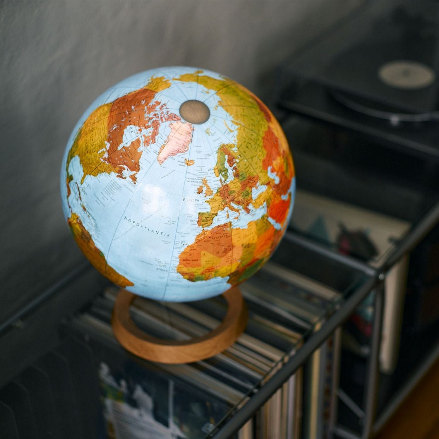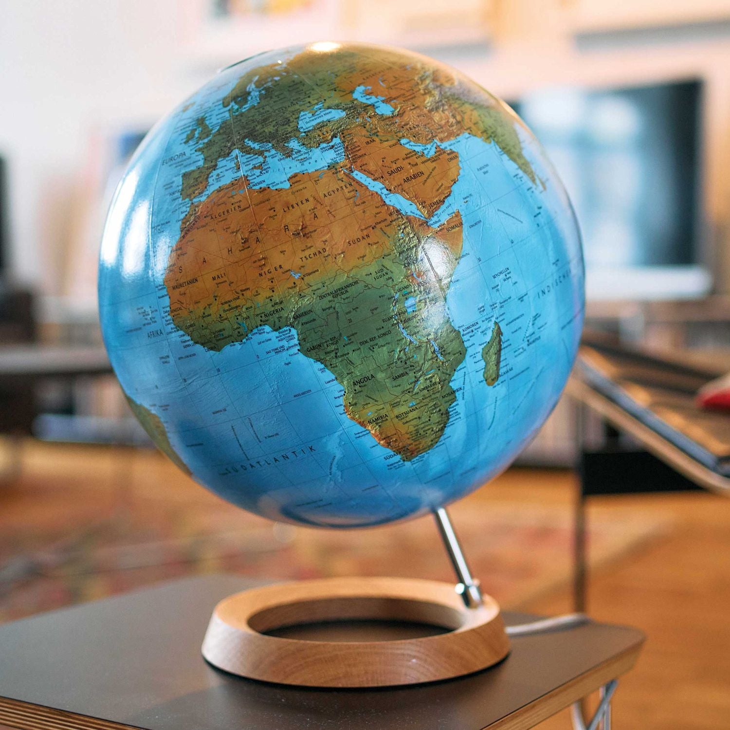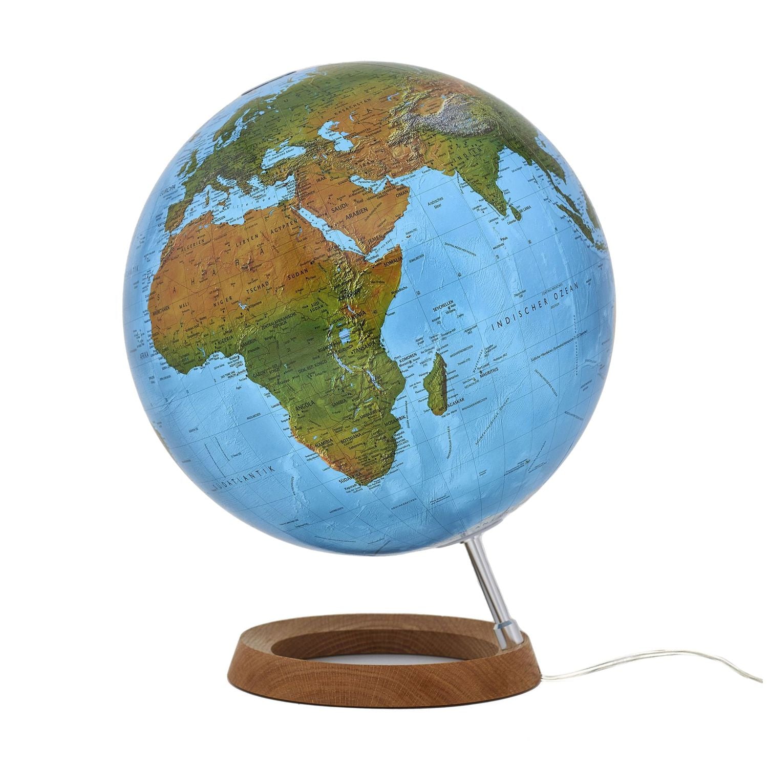 Der Globus wird von einer Schrägstütze aus Aluminium getragen, die auf einem ringförmigen Fuß aus Eichenholz steht.