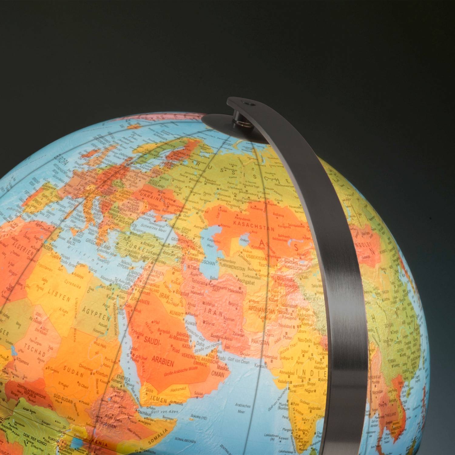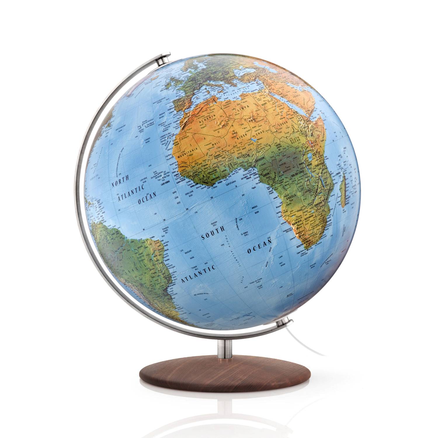 Räthgloben Doppelbild-Leuchtglobus, handkaschiert, 37 cm Durchmesser, 42 cm Höhe, physische und politische Kartografie, unterschiedliche Gestelle - Esche, Eiche oder EdelstahlDieser repräsentative Doppelbild-Leuchtglobus verbindet auf gekonnte Art und Weise Tradition und Moderne. Eine traditionell von Hand kaschierte Kugel mit einem Durchmesser von 37 cm, eine für Tische praktische Höhe von 42 cm und einer auf aktuellen Satellitendaten und -bildern basierenden Kartografie, wird mit einem modern designten Gestell kombiniert. Wird der Globus beleuchtet, wird ein politisches Kartenbild gezeigt. Ist die Beleuchtung aus, zeigt der Globus ein physisches Kartenbild. Die Beschriftung ist in gut leserlicher, deutscher Sprache verfasst.