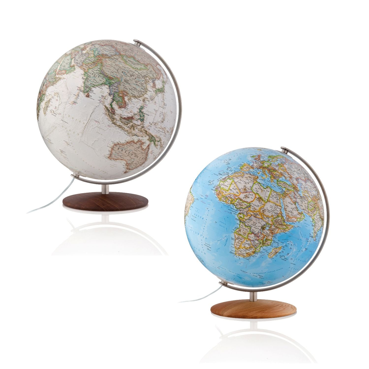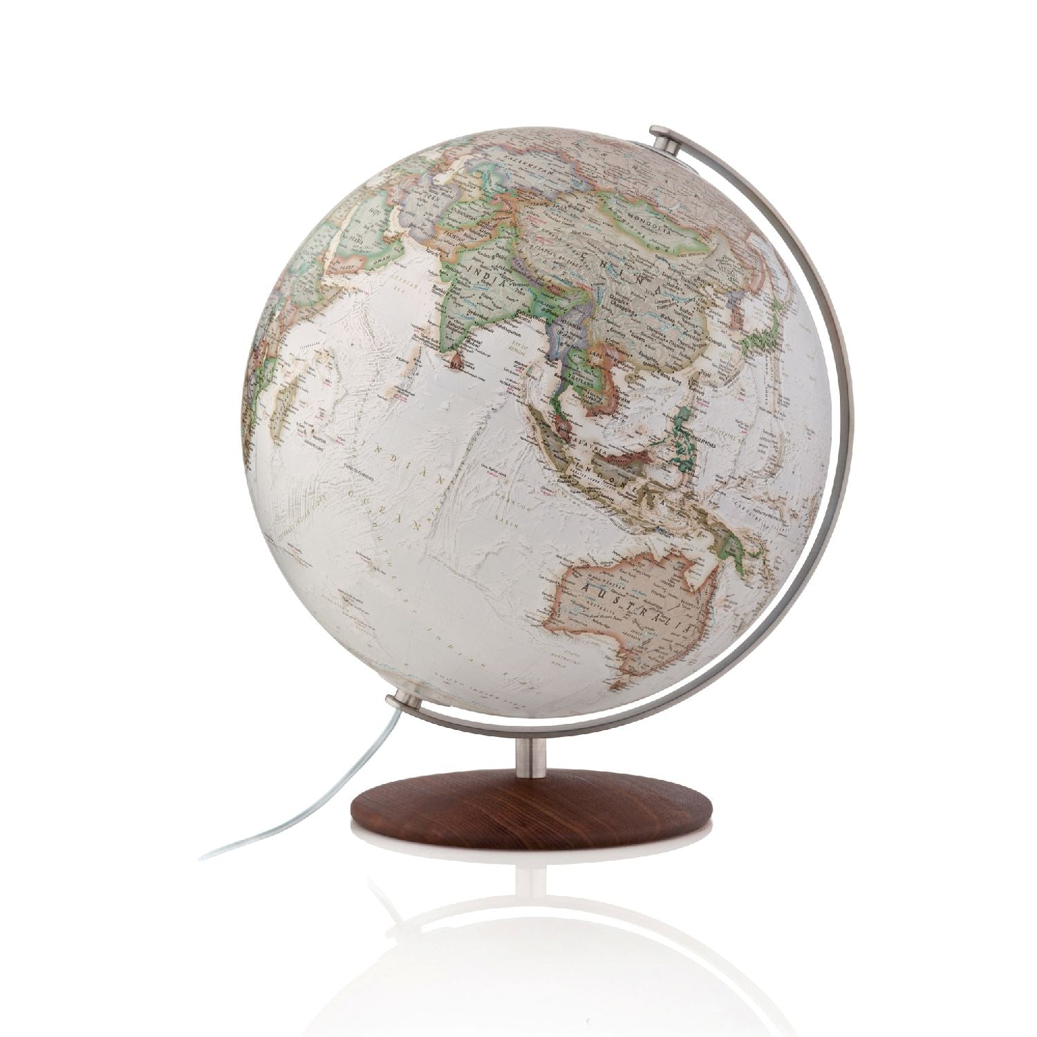 Dieser beleuchtete Tischglobus von National Geographic verbindet auf gekonnte Art und Weise Tradition und Moderne. Die Kugel hat einem Durchmesser von 37 cm und ist tradtionell handkaschiert mit der durch die National Geographic Maps Division erstellten Kartographie "Classic" oder "Executive". Das Kartenbild ist im Wesentlichen politisch, physische Informationen sind durch Schattierungen angedeutet. Über 2.000 geografische Namen sind auf diesem handkaschierten Leuchtglobus verzeichnet.